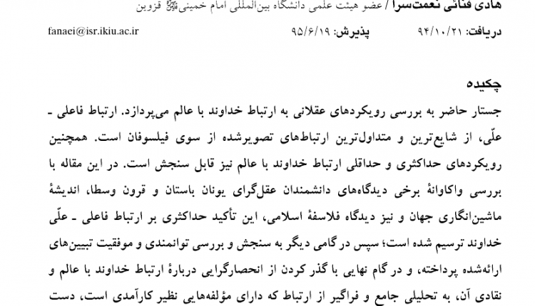 كليدواژه ها: خداوند، ارتباط، عالم، فاعليت، عليت، حدوث، بقا.
